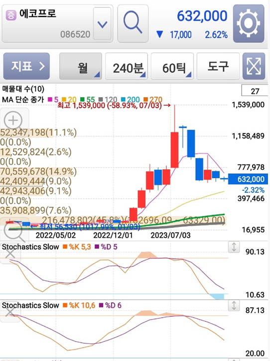 대한민국 사람중에 이 종목 모르는 사람 있나요? 다 알지만 그래도 정리를 먼저 해봅니다. 오늘 날짜로 코스닥 시총 2위에 있는 종목으로 유동비율이 73.37% 입니다. 2022년 12월 29일 102,700원에서 2023년 7월 26일 최고가 1,539,000원을 찍고 현재는 632,000원 입니다.